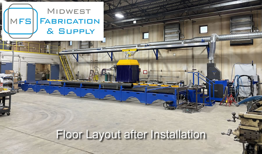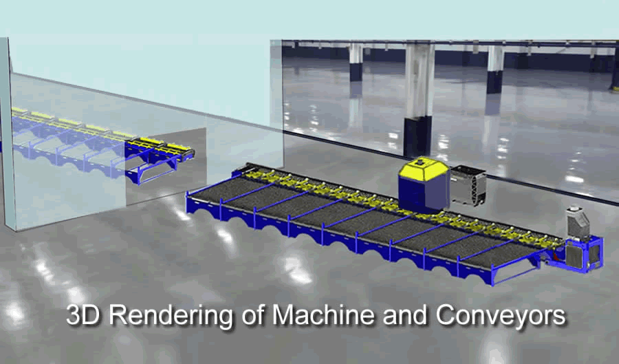 This second 3D Rendering shows how the Watts team helped Midwest Fabrication & Supply overcome a fixed flooring situation where they needed a new machine, but also needed to expand to accomodate 40ft pipe. This rendering shows how we were able to install a customized conveyor system outside the facility (see a photo of the outside conveyor in the Midwest customer story).